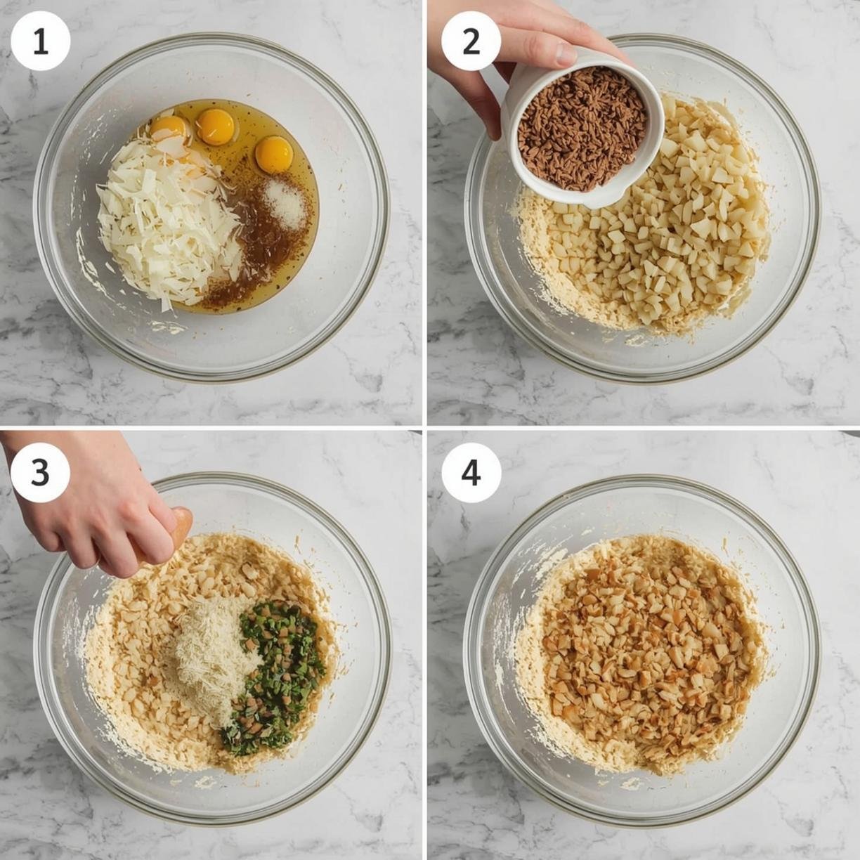 6. Mix ingredients: Add cooled onions, Worcestershire sauce, garlic powder, onion powder, thyme, salt, and pepper. Fold together until evenly incorporated.